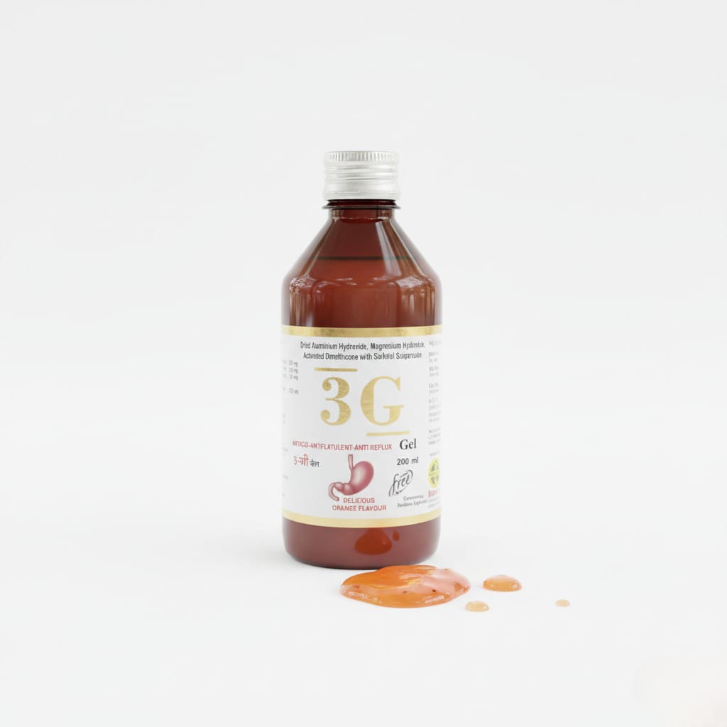 3G GEL is a $200 \text{ ml}$ Delicious Orange Flavour triple-action gel for quick relief from acidity, reflux, and gas.