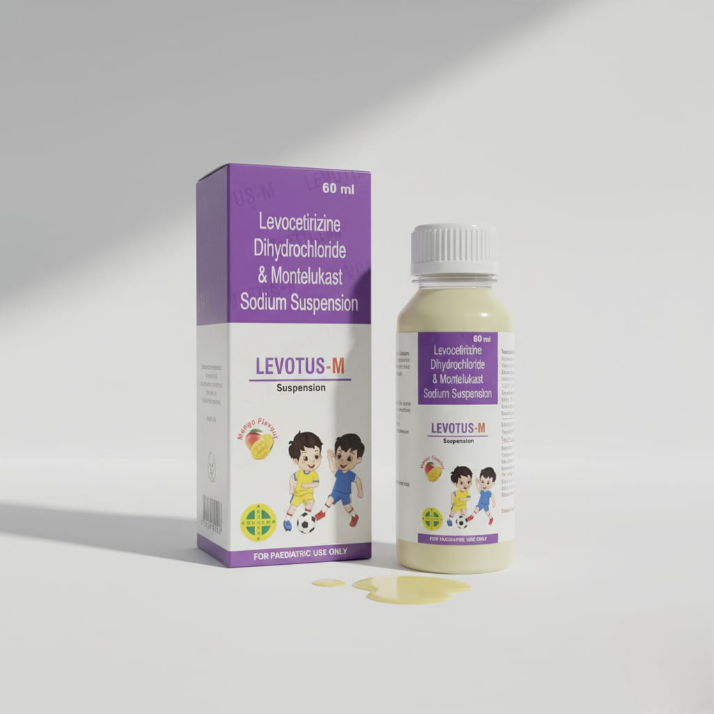 LEVOTUS-M SUSPENSION is a mango-flavored liquid medication specifically formulated For Paediatric Use Only. It combines an advanced antihistamine with a leukotriene receptor antagonist, making it highly effective for managing chronic allergic conditions, allergic rhinitis (hay fever), and preventing symptoms of asthma in children.