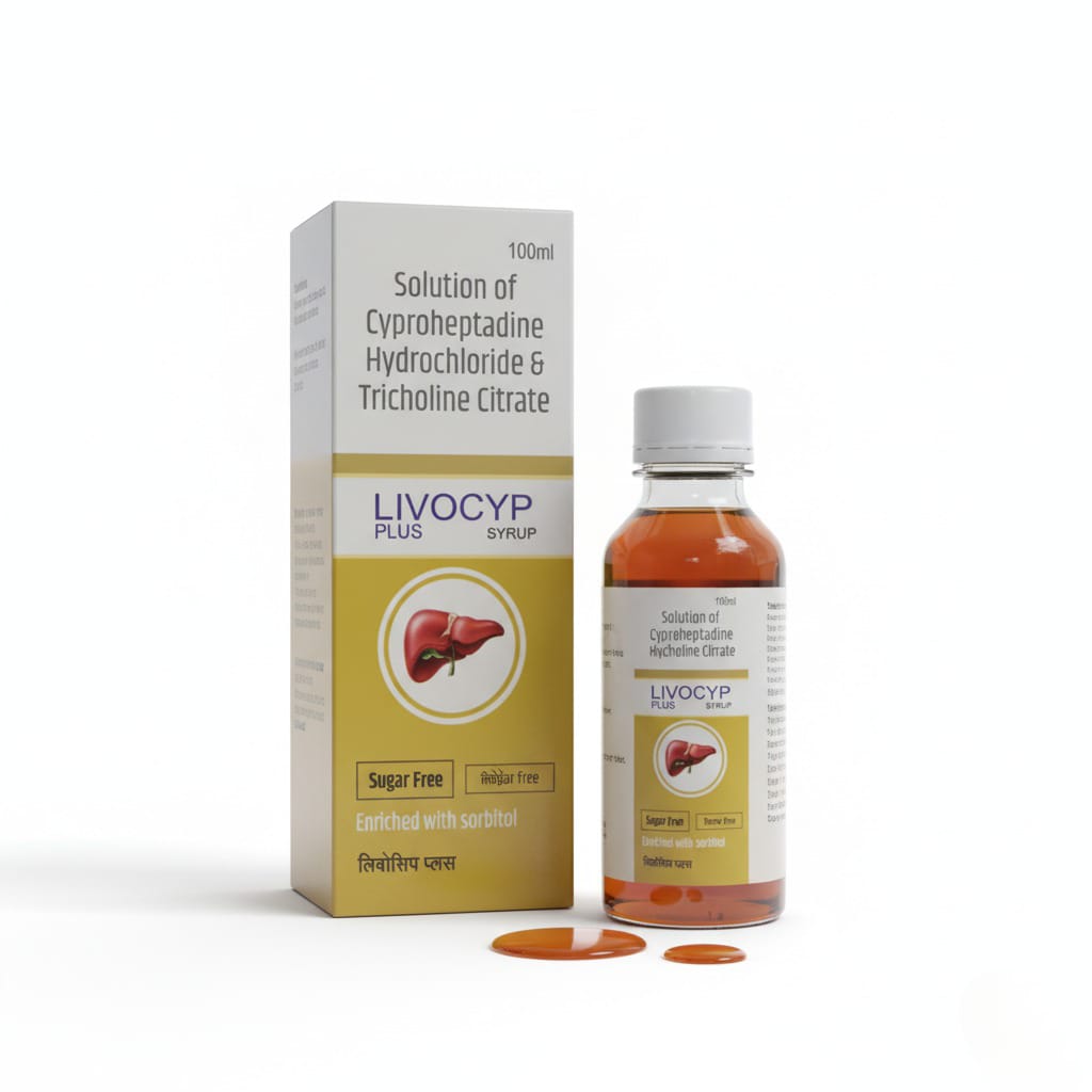 LIVOCYP PLUS SYRUP is a specialized formula combining an appetite stimulant with a lipotropic agent, designed to boost appetite and support liver function. The syrup is Sugar Free and enriched with Sorbitol, making it palatable and accessible for many users.